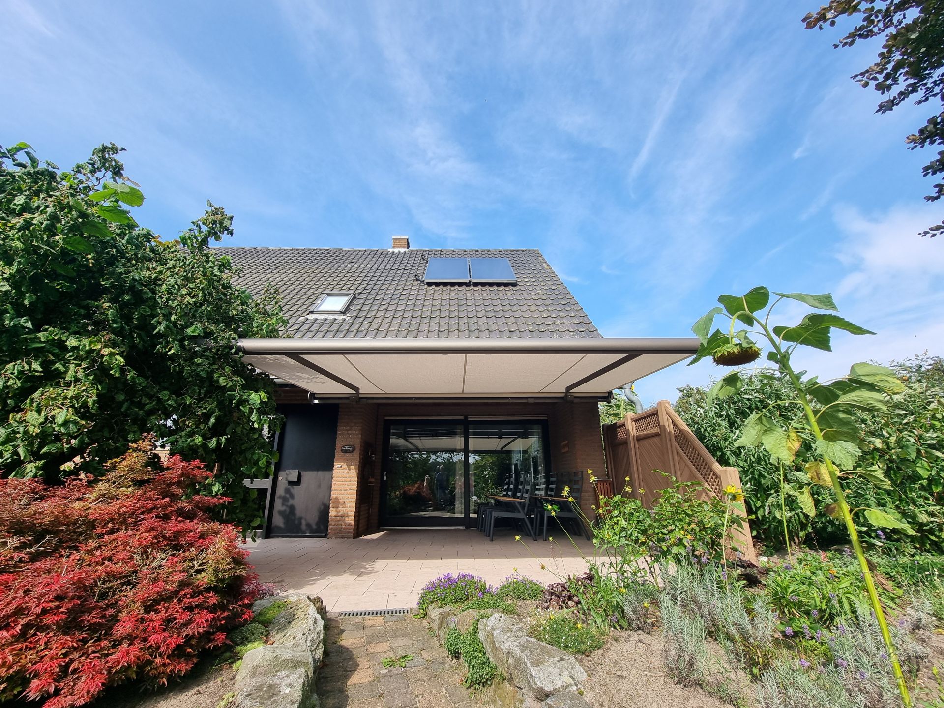 Vario-Volant: Optional mit einem in die Fallstange integrierten Vario-Volant erhältlich. Der Vario-Volant fungiert als vertikales Rollo und schützt somit auch in den Abendstunden bei tiefstehender Sonne.